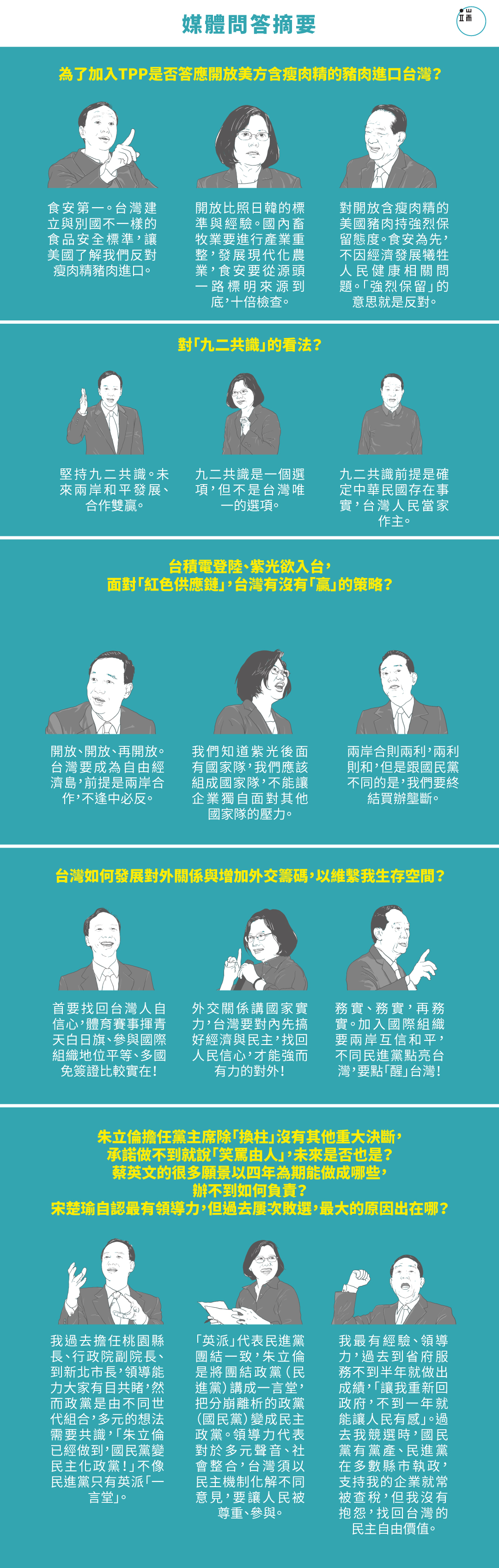 一張圖看三位候選人,怎麼回答媒體提問? 投入2016年台灣總統大選的三黨總統候選人,27日在首場電視辯論會上,言語交鋒不斷;但在三人針鋒相對之餘,他們... 端傳媒台灣組 刊登於 2015-12-27 2016台灣大選 台灣 選舉 投入2016年台灣總統大選的三黨總統候選人,27日在首場電視辯論會上,言語交鋒不斷;但在三人針鋒相對之餘,他們究竟對開放含有瘦肉精的美國豬肉、九二共識、紅色供應鏈、外交、領導力等問題有何看法與主張?端傳媒用一張圖帶大家快速了解…… 圖:端傳媒設計部