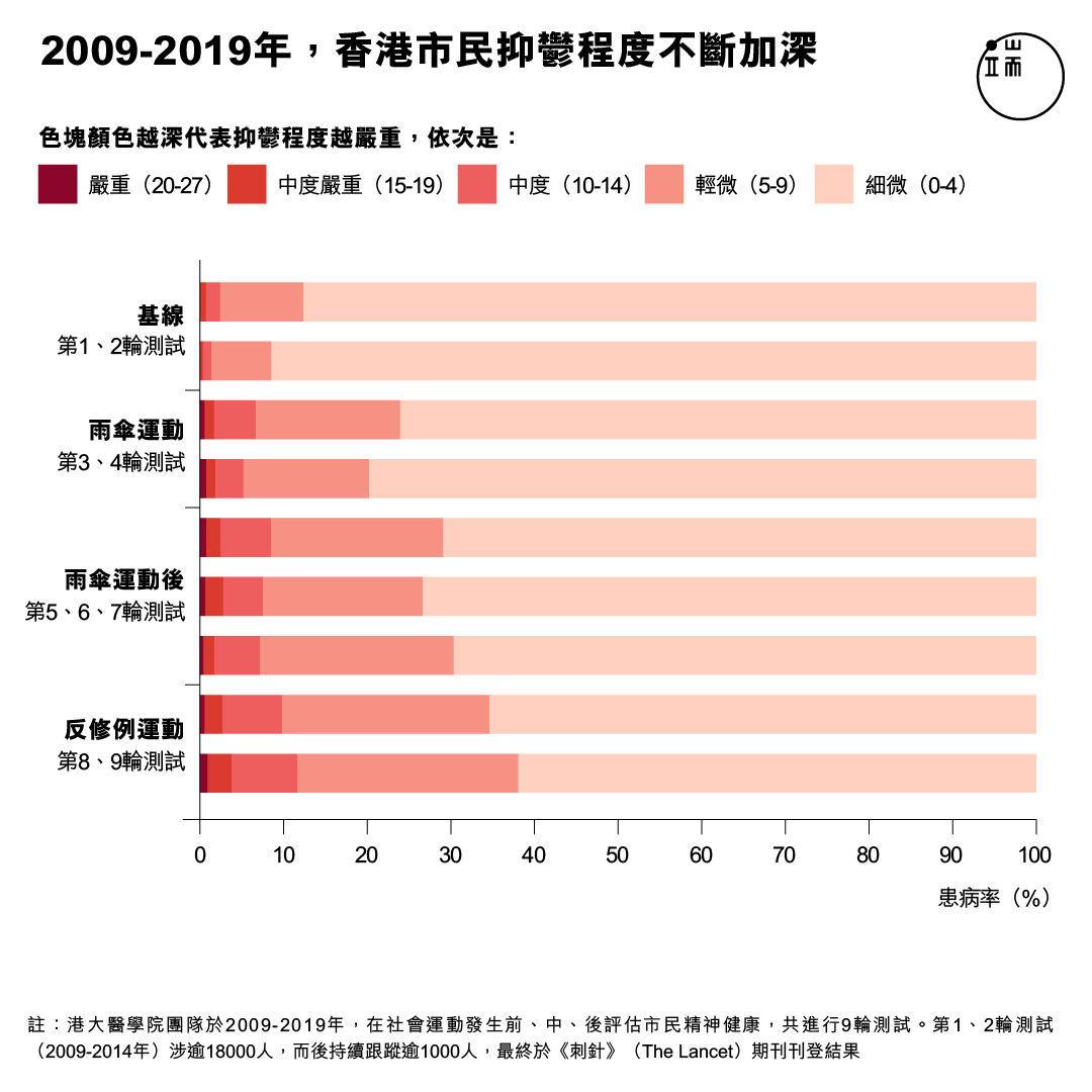 另一項重要研究引出更沉重的結論。香港大學醫學院團隊追蹤研究港人精神狀況超過十年,今年1月在醫學權威期刊《刺針》發表研究結果,指出港人抑鬱狀況不斷加深,特別在雨傘運動、反修例運動後,抑鬱、PTSD等狀況更加明顯。該研究推算全港或有240萬人患抑鬱症、200萬人患PTSD。這項研究還指出,這種患病率,通常會在社會經歷大型災難、武裝衝突或恐怖襲擊後出現。