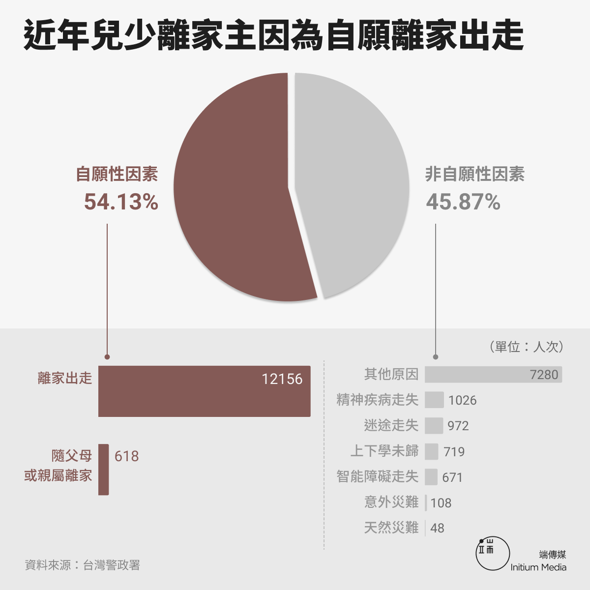 曾任兒福聯盟失蹤兒少中心組長的謝欣伶告訴端傳媒,近20年來,失蹤兒少中心接獲的案例有九成為自願離家,其中包含被父母或其他家人帶離。她提醒,「自願有各種型態,有遭家人虐待而逃離,也有自己想外出闖蕩的案例。」