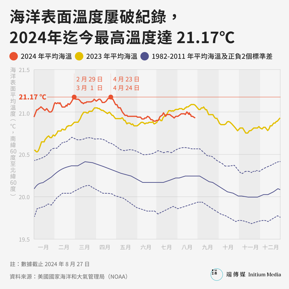 近兩年,海洋頻頻給地球敲響警鐘。自2023年起,海洋溫度不斷打破歷史最高紀錄。在今年2月,全球平均海溫達到21.17攝氏度,相對於1982年至2011年的平均值,高出1攝氏度。以海洋大約13億立方千米的體積計算,相當於增加了5.46x10^24J的熱量,堪比台灣所有發電廠六百萬年的總發電量。