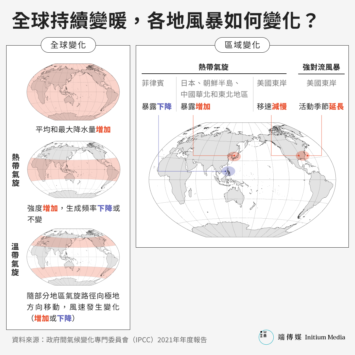 政府間氣候變化專門委員會(IPCC)在2021年年度報告中特別指出,北緯30度以北的西北太平洋和北大西洋沿岸暴露於熱帶氣旋的風險將會增加。這大致對應中國的華北和東北地區、朝鮮半島、日本,以及美國東海岸,相對於原本更易受颱風影響的熱帶低緯度濱海地帶,這些地區應對颱風的基礎設施和防災經驗都更顯不足。