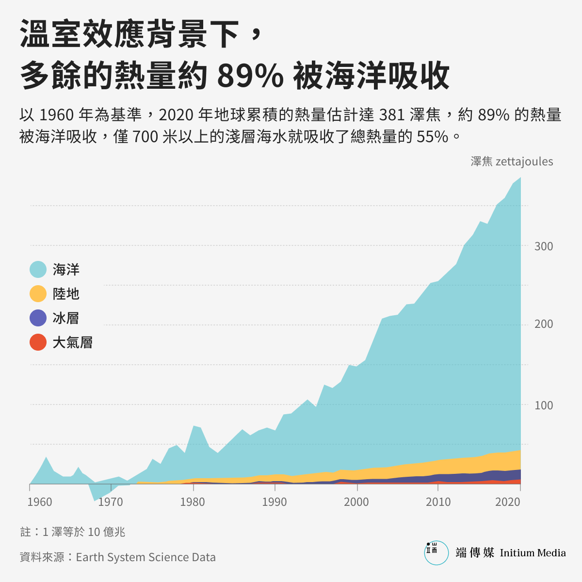 當人們談論氣候變化,很容易將視線集中在陸地表面。事實上,全球氣候變暖的影響已深深蔓延到海洋——這片覆蓋地球表面70%的水體,猶如一個無休無止的大型吸熱器,正吸納着人類社會產生熱量。數十年來,海洋不僅吸收了人類產生約四分之一的二氧化碳,還有九成因溫室氣體增加而導致滯留在大氣層中的多餘熱量——而海洋吸收的熱量遠遠超過陸地、大氣層和冰蓋。