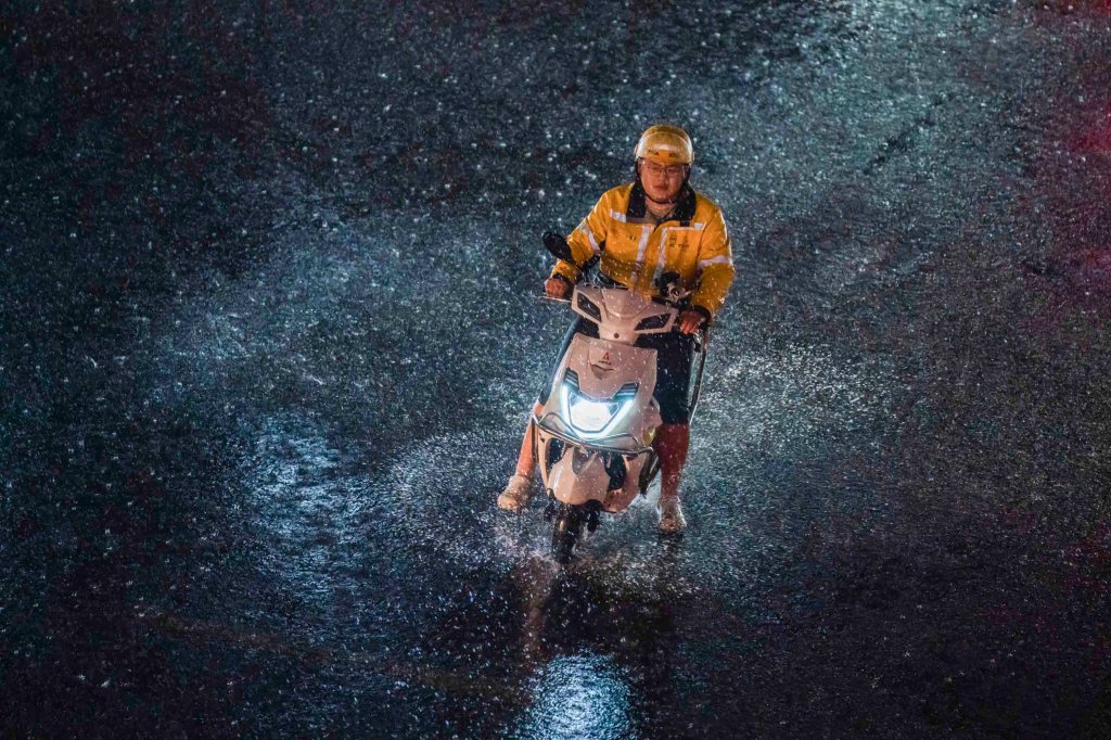 2023年9月11日,中國重慶,一名美團外賣騎手在雨中騎車。攝:Costfoto/NurPhoto via Getty Images