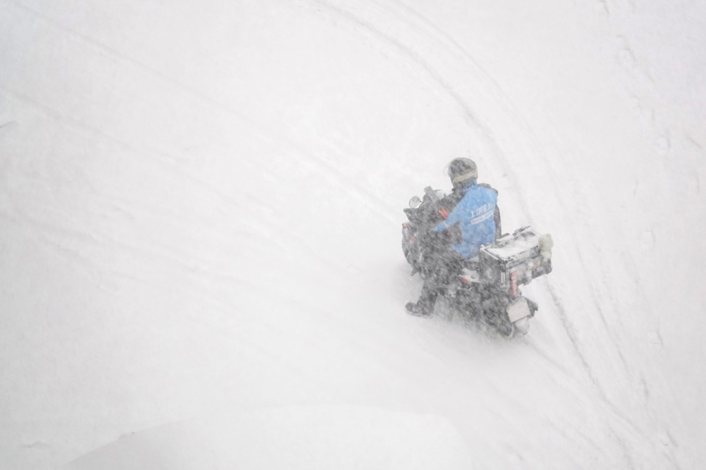 2023年12月16日,中國煙台,一名餓了麼外賣騎手在街道上冒雪送餐。攝: Costfoto/NurPhoto via Getty Images