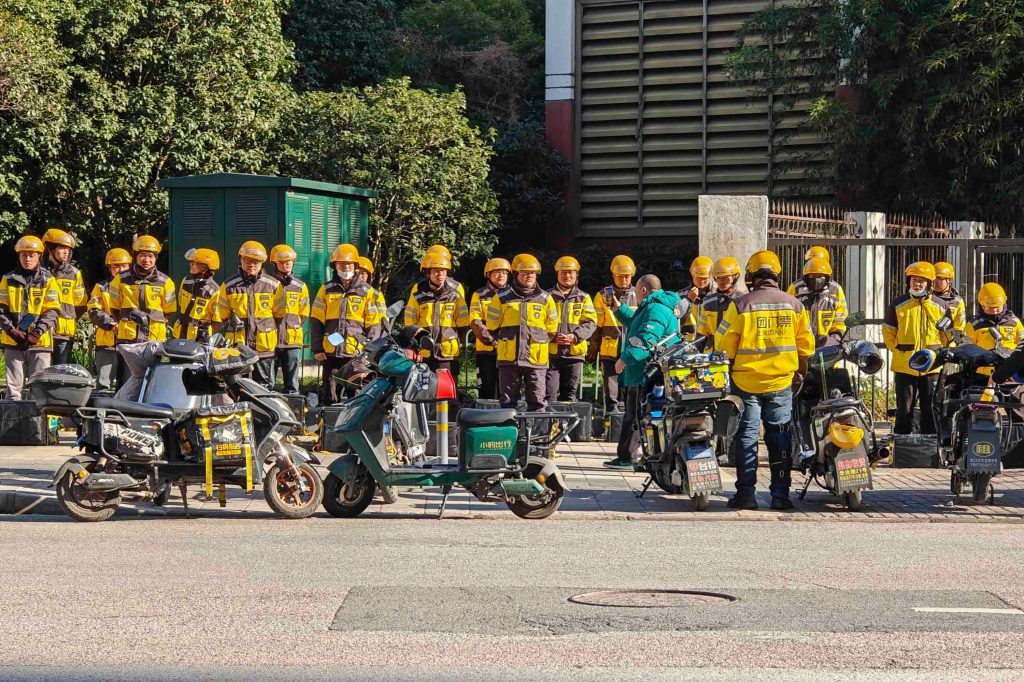 2024年1月14日,中國上海,許多美團外賣騎手正在排隊準備開工。 攝:Costfoto/NurPhoto via Getty Images