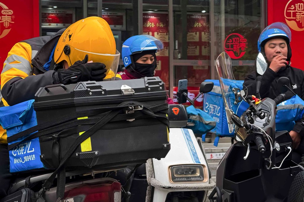 2024年12月29日,中國重慶,美團和餓了麼的外賣騎手在電單車上等待訂單時休息。攝:Cheng Xin/Getty Images