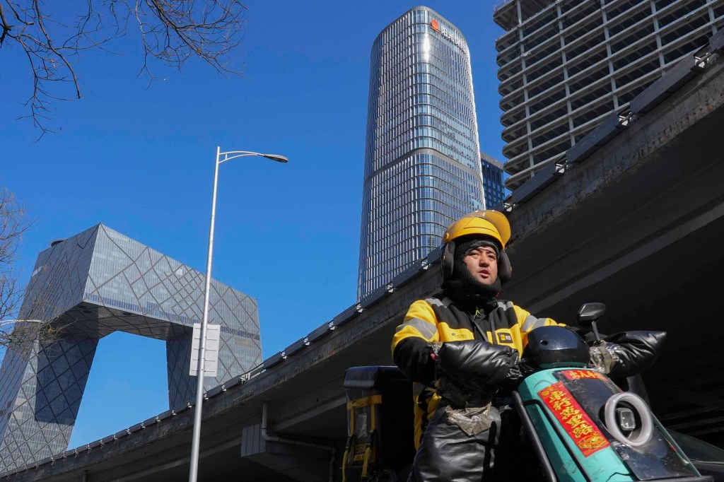 2025年2月20日,中國北京,一名美團外賣騎手騎著電動自行車在路上行駛。攝:Zhao Wenyu/China News Service/VCG via Getty Images