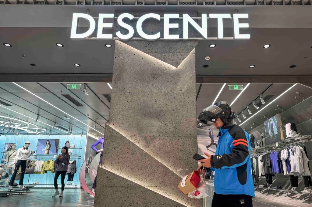 2025年3月22日,中國重慶,一名外賣騎手走過購物中心的 DESCENTE 零售店。攝:Cheng Xin/Getty Images