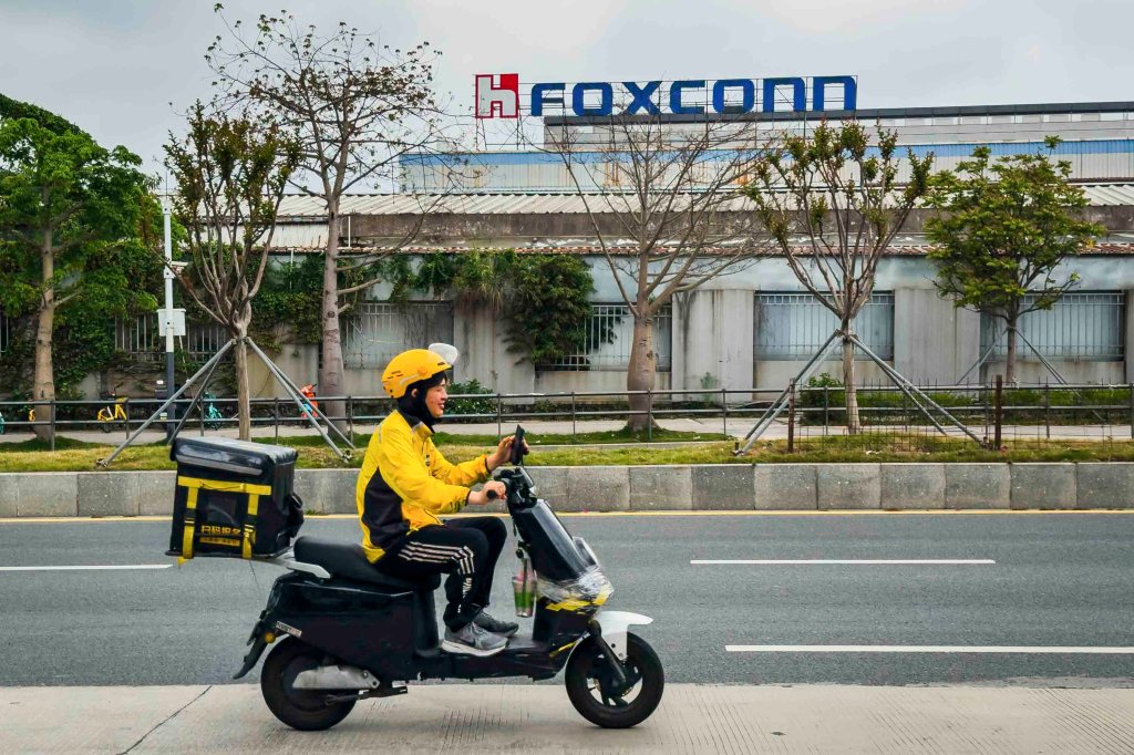 2025年4月12日,中國深圳,一名美團外賣騎手騎著電動滑板車經過富士康製造園區。攝:Cheng Xin/Getty Images