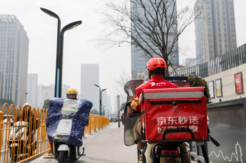 2025年3月5日,中國杭州,京東外賣騎手在道路上騎著電動自行車。攝:Luan Lan/Zhejiang Daily Press Group/VCG via Getty Images