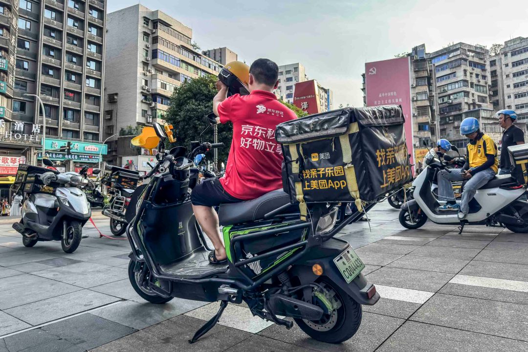 2025年5月26日,中國重慶,一名身穿京東物流制服的外賣騎手坐在美團配送箱旁的電動滑板車上調整頭盔,附近還有其他幾名外賣騎手。隨著外賣需求不斷增長,京東、美團和餓了麼等平台爭奪市場份額。攝:Cheng Xin/Getty Images