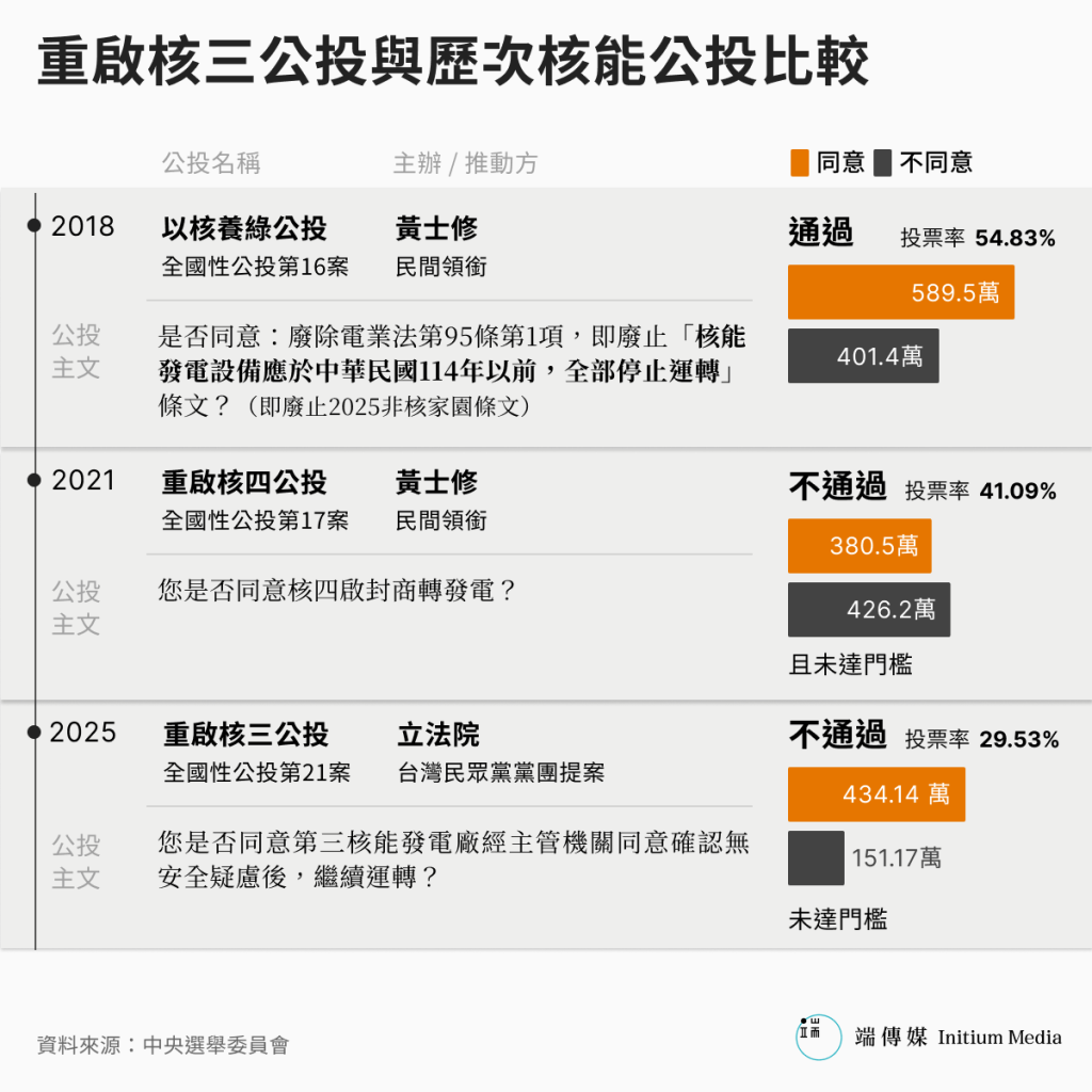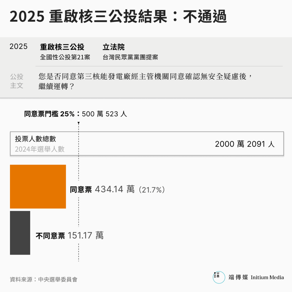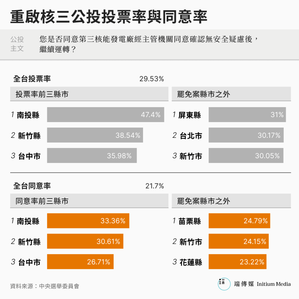 至於民眾黨發起的「核三重啟」公投,雖然同意票大於不同意票,但同意票約430萬票,未達25%門檻(500萬523張),該案遭否決。