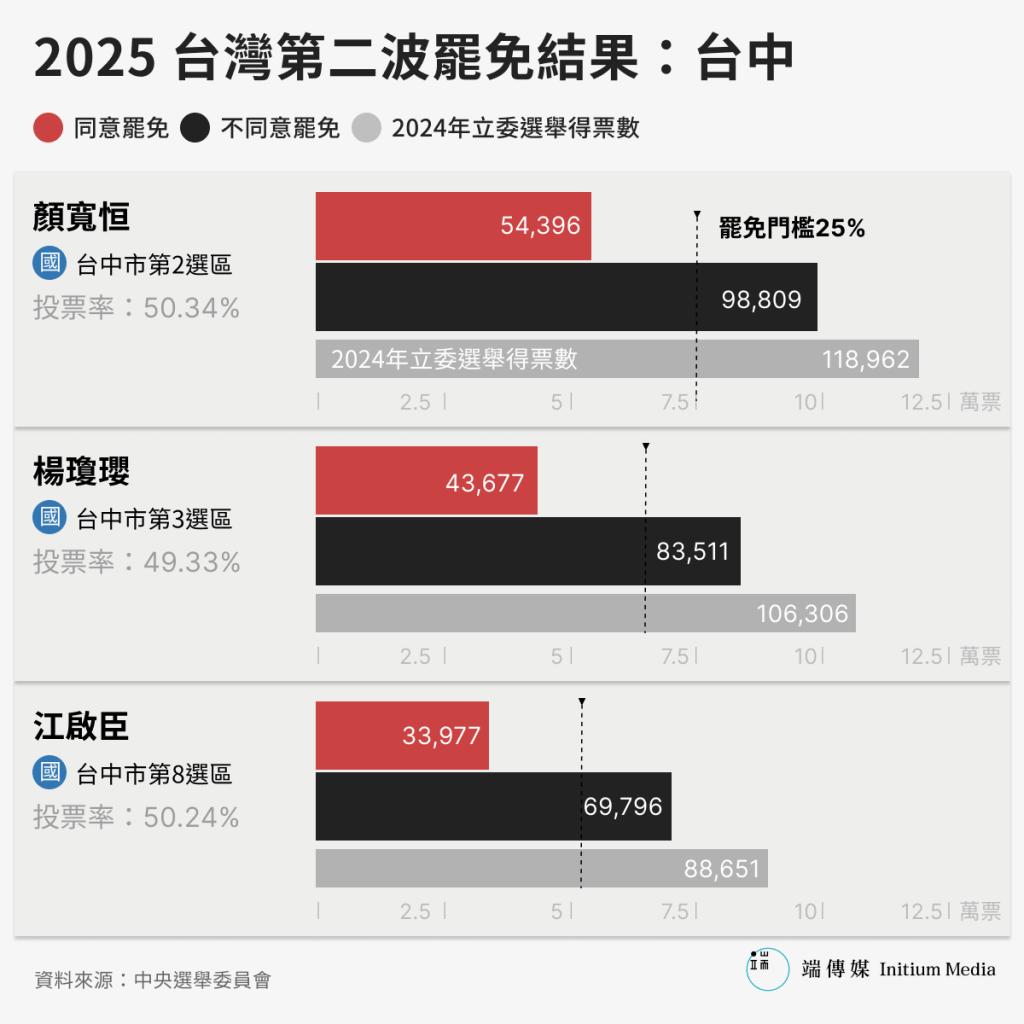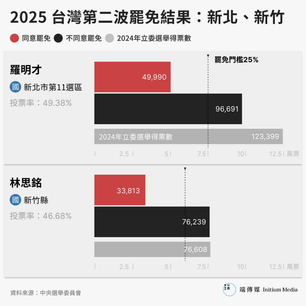 台灣前所未見的「大罷免」浪潮於23日舉行第二波投票,針對新北市、台中市、新竹縣、南投縣四地合共七名國民黨立法委員的罷免案進行投票;「核三重啟」公民投票也在全台同步進行。最終,藍營複製726第一波罷免投票的戰果,七位藍委全數保住職位,宣告公民團體發起的全台罷免行動全面失利。
