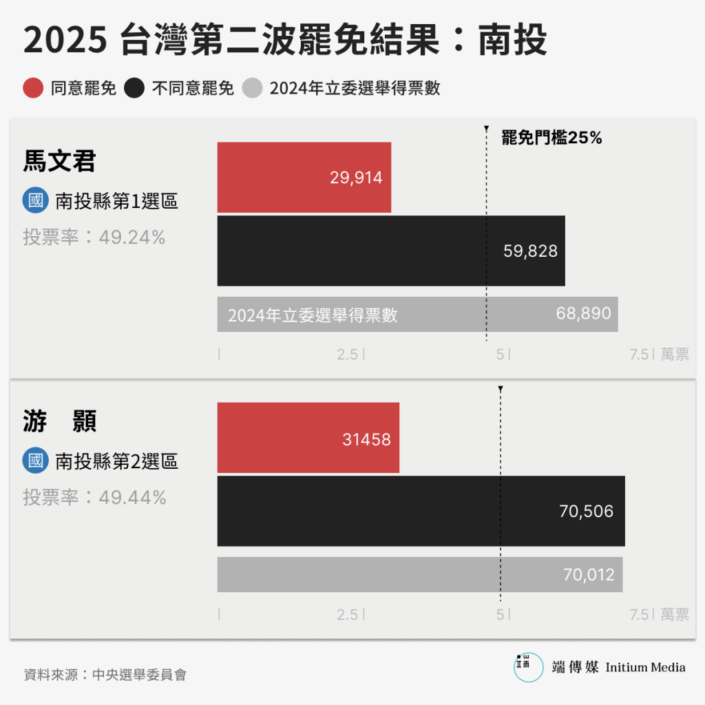 南投縣區域立委馬文君也批評罷免選舉「勞民傷財」,呼籲罷免過後台灣應「放下對立」,讓台灣社會回歸理性討論,推動進步。針對行政院改組,她認為目前只是「小改組」,未能真正落實專業與民意,呼籲政府應「大破大立」,廣納各方意見。
