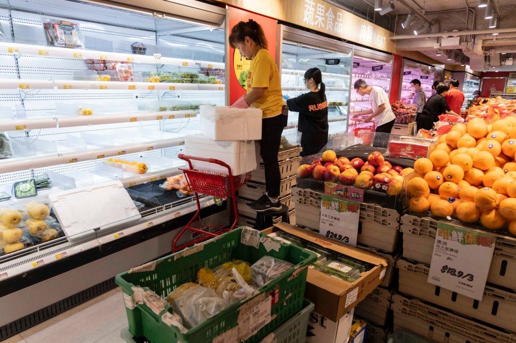 2025年9月23日,超強颱風樺加沙逐步靠近香港,市民提早購入儲並起糧食清空部分食物架,職員陸續將剛送達的蔬菜上架。攝:鄧家烜/端傳媒