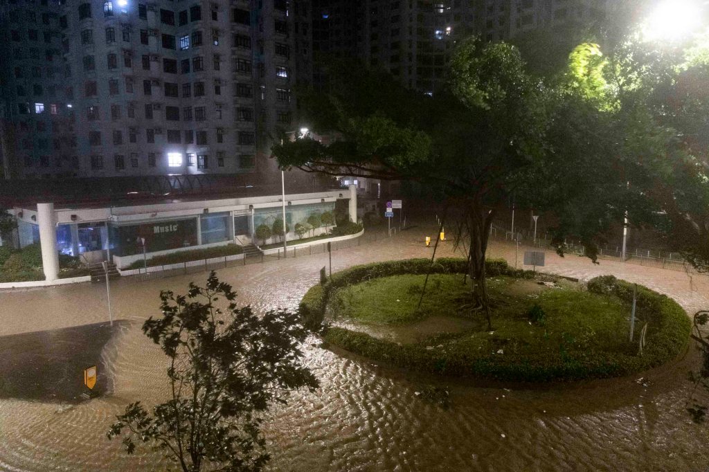 2025年9月24日,超強颱風樺加沙襲港,海水湧至杏花邨迴旋處導致水浸。攝:鄧家烜/端傳媒