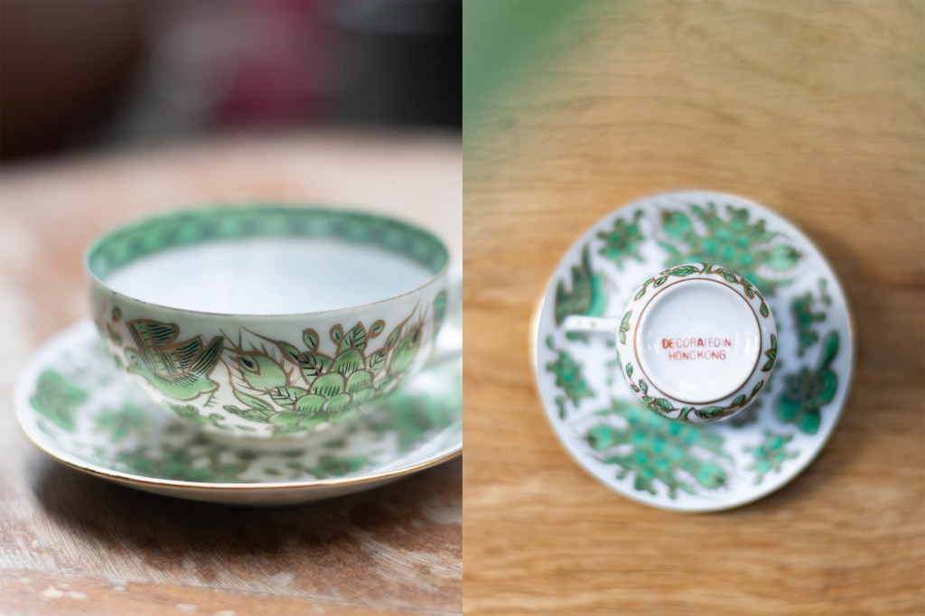 日本版《香港百貨》的封面是一幅綠色綑金漆邊花葉圖案的瓷器杯碟組,香港粵東磁廠五、六十年代生產,杯底紅色筆跡寫著「日本燒製,香港上色」。這個杯碟組也是美由紀過去在摩羅上街找到的寶物。當年韓戰爆發令中國產品被禁運,磁廠需改由日本進口瓷胎加以說明,才能出口。而日本進口的瓷胎剛好來自美由紀的故鄉名古屋,歷史翻了一個摺,瓷器杯碟又成為一本日本人撰寫的《香港百貨》封面圖片。