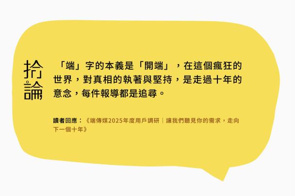 歡迎你繼續在端傳媒網站、應用程式和各社交媒體平台撰寫評論或分享所想,有更多意見或回饋也可寫信給我們(editor@theinitium.com)。我們期待聆聽你的想法。