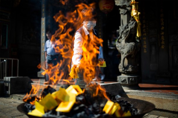 2025年9月3日,元朗大江埔盂蘭勝會,群眾在火爐化寶燒衣。攝:鄧家烜/端傳媒