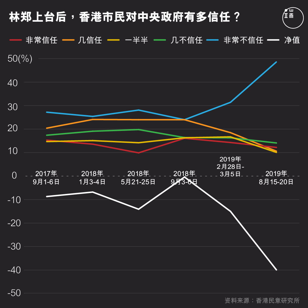由此可见,从大湾区整个政策制定过程看,大湾区规划缺乏公众参与和民意授权,是由中港政府和建制主导规划权,准备好文件和细节再交予香港市民接受。这种由上而下、缺乏公众参与和透明度的规划可能在珠三角九市是常规操作,但在香港容易引起“被规划”的质疑,尤其是当下香港政府的民望和威信跌至低点,港人又对中央政府缺乏信任。前身为香港大学民意研究计划的香港民意研究所于8月中所做的民调显示,港人对中央政府的信任比率占23%,不信任比率为63%,当中表示“非常不信任”的比率接近一半(48.6%),创1992年有历史纪录以来的新高。根据该机构同期的另一个调查,港人对香港政府的不信任比率有63.9%,当中表示“非常不信任”达50.8%,同样是历史新高。