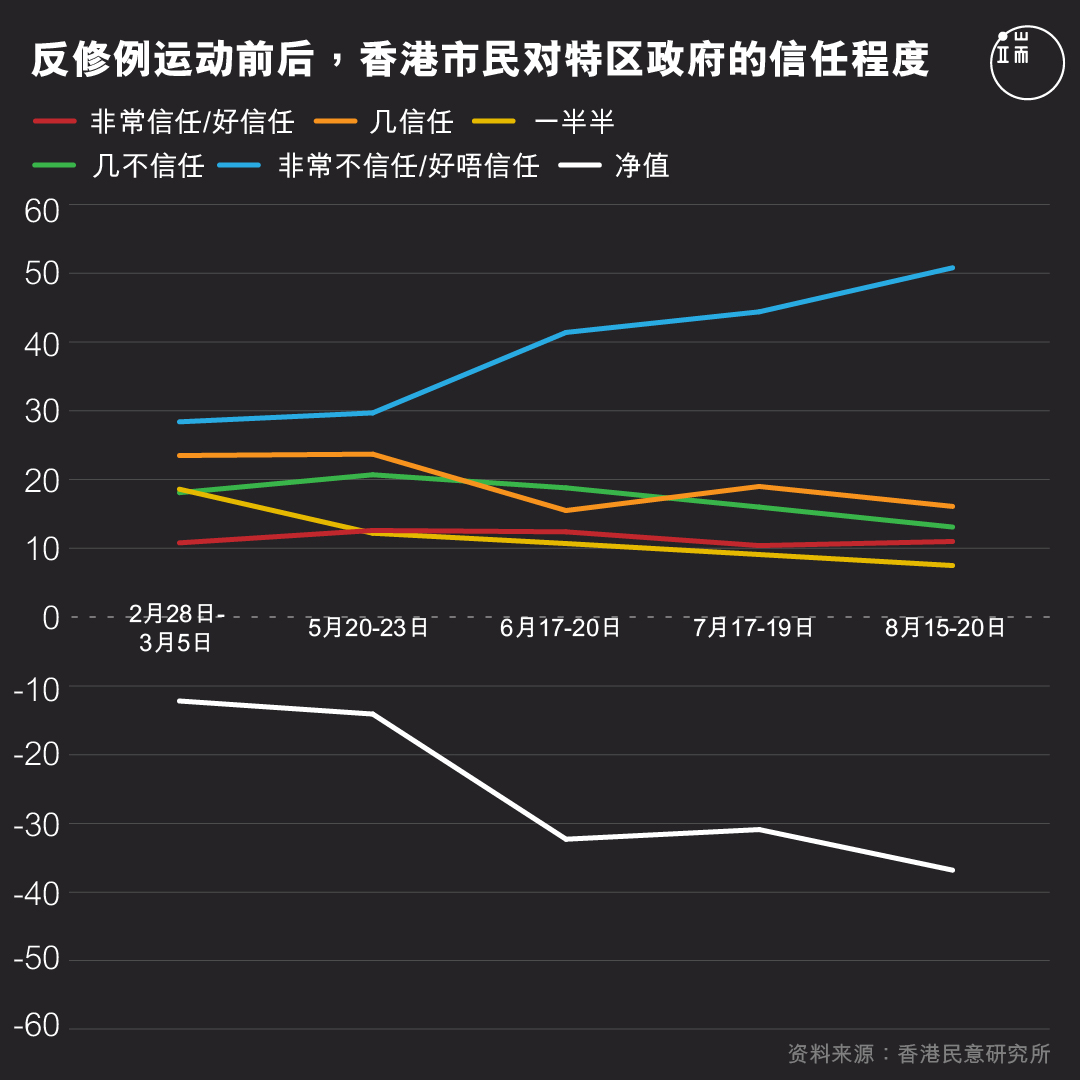 反修例运动遍地开花,运动已不止令香港青年加入社会运动,更唤起他们对建制和中港政府的不满。根据香港民意研究所于7月受“公民实践培育基金”委托编撰《反送中事件—民间民情报告》,年轻组群的意见明显有异于其他人士,九成年轻人反对逃犯条例修订,他们的不满主要建基于对政府和制度的不信任,和对民主自由的追求,而反修例运动的各大诉求均获至少六成多年轻人支持。按此推论,反修例运动已令主流香港青年对制度埋下不信任的基础,对于大湾区这样的官方规划,相信主流的香港青年要不是无感,就是反感和抗拒。