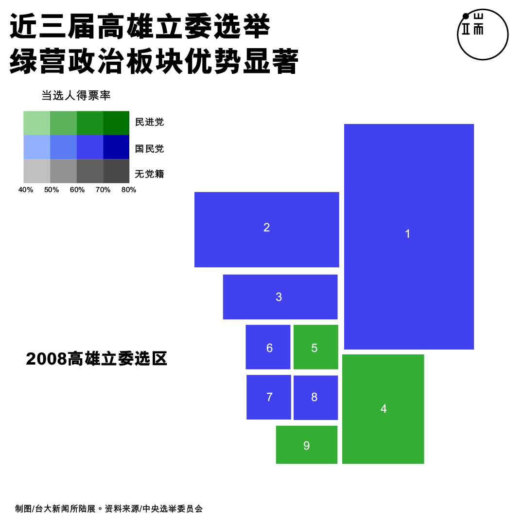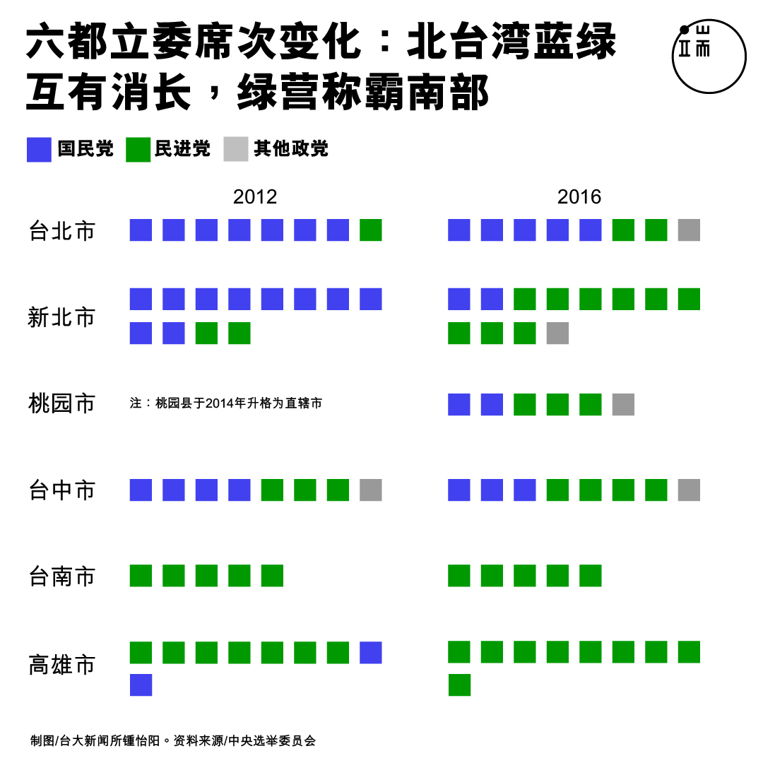 「關於藍綠在地區的消長」的第一張圖,2012年高雄市的藍綠畫反了喔