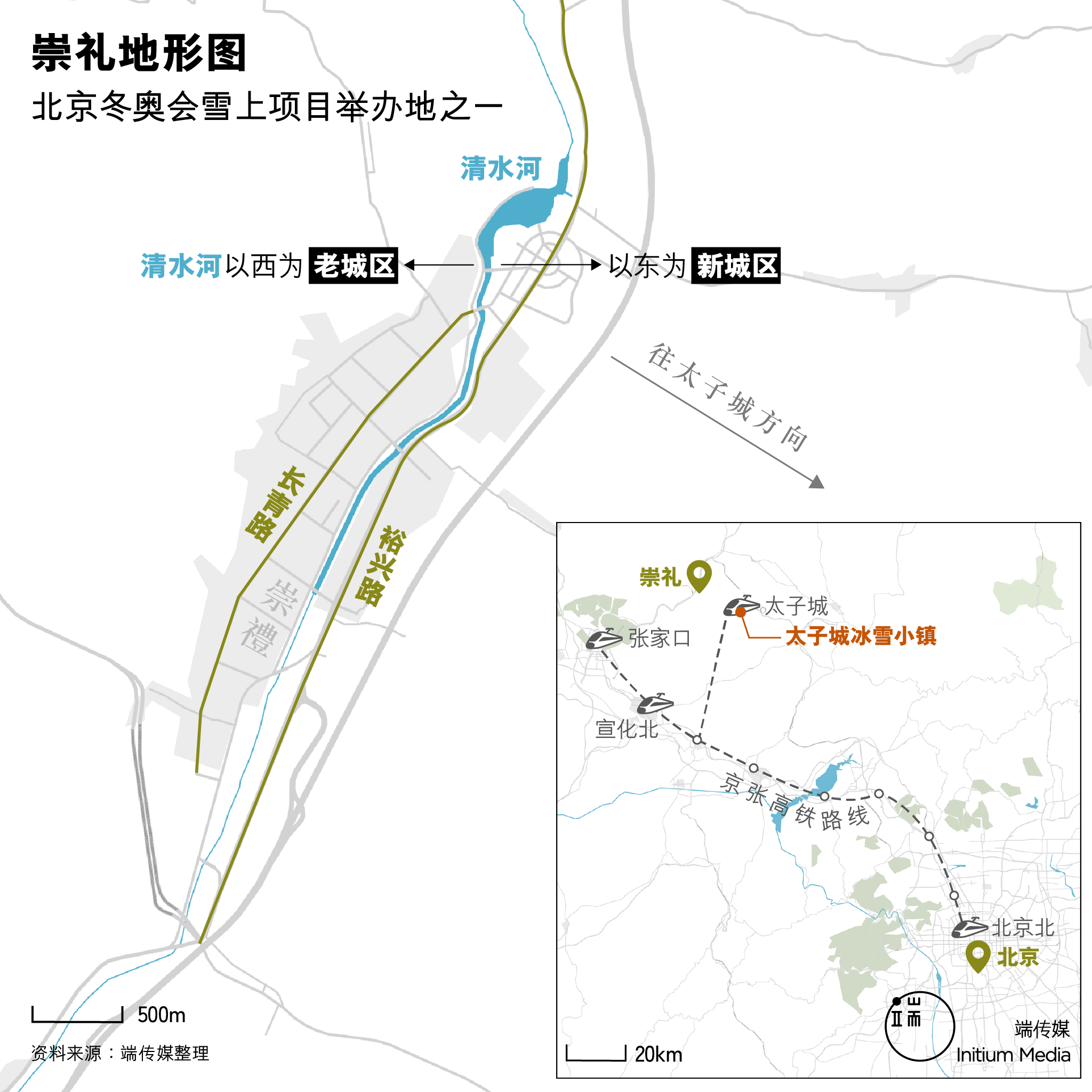 这座被冬奥会改变命运的县城只有两条路。裕兴路贯穿新城区,长青路贯穿老城区,中间是一条清水河。