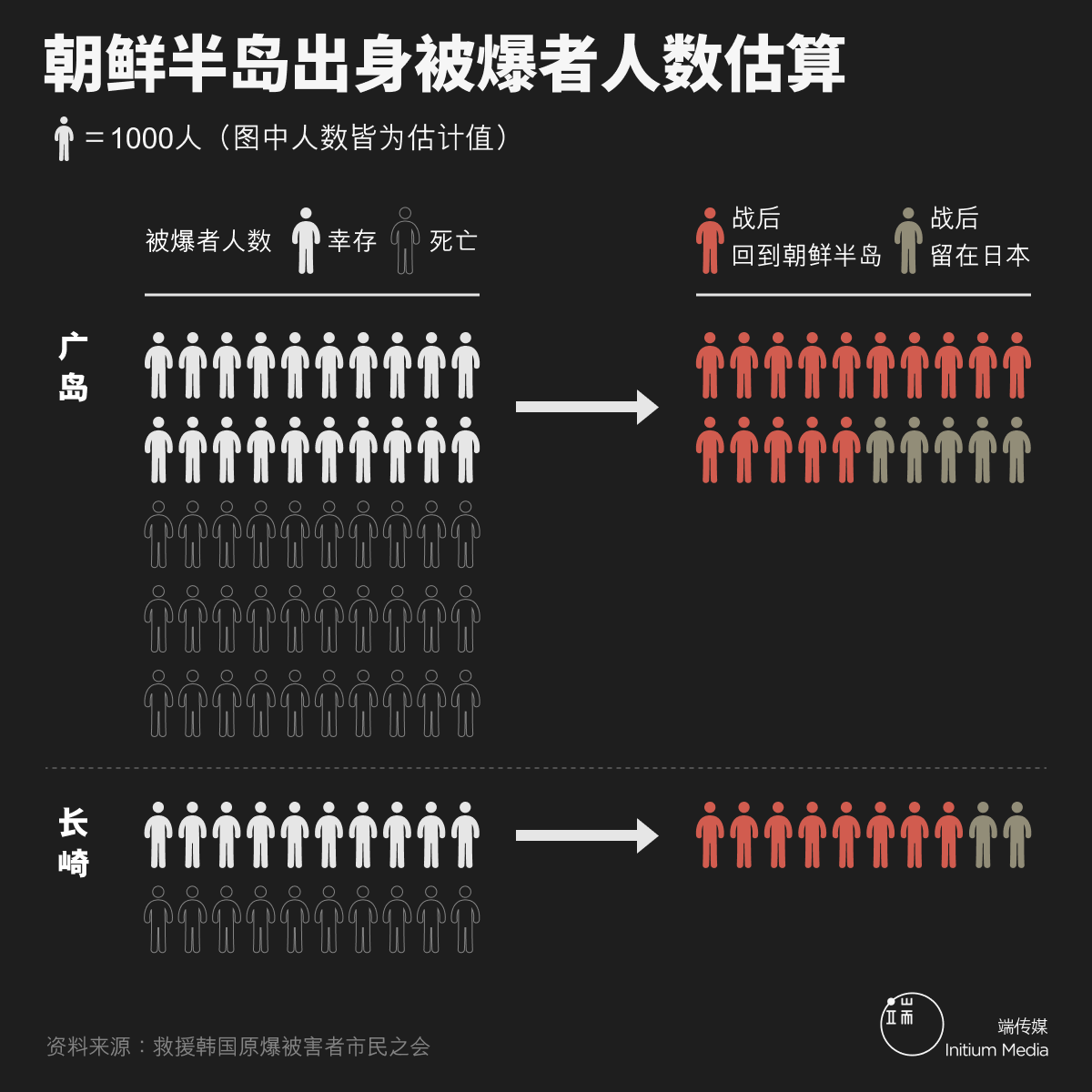 另根据韩国政府2010年出版的“广岛与长崎的朝鲜人核武受害调查”报告书,1930年在广岛的朝鲜半岛出身者只有7,189人,但到了1945年就成长到8万4,886人。在长崎的朝鲜半岛出身者也从1930年的4,944人,到1945年成长到6万1,773人。广岛和长崎在日本殖民统治后期会有这么多朝鲜半岛出身者,主要与当时两座城市都是军需工业重镇,需要大量劳动力支撑产业发展有关。