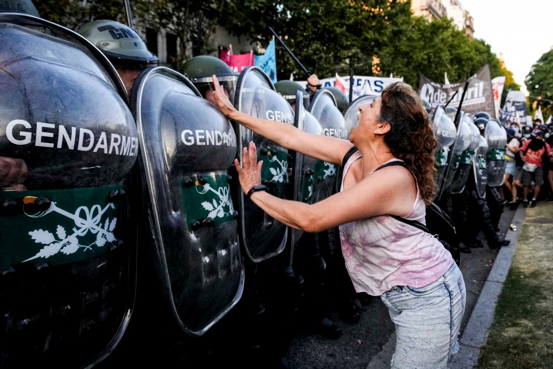 端传媒图片编辑每天会为日报精选一张全球新闻摄影作品。今天的题图来自美联社南锥体新闻总监 Natacha Pisarenko:2024年2月1日,阿根廷布宜诺斯艾利斯,国会正在辩论阿根廷总统米莱提出的一项法案,反政府示威者在国会外抗议,与警察对峙。