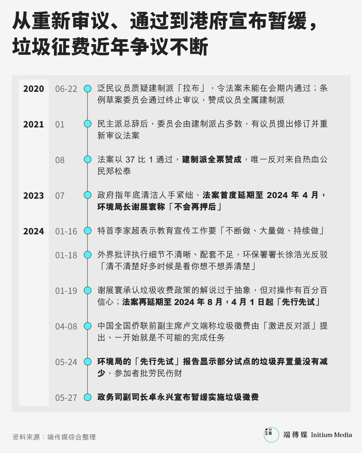 5月27日,环境及生态局局长谢展寰和政务司副司长卓永兴再宣布暂缓垃圾征费,未有订明落实日子。卓永兴指,“先行先试”参加者认为操作繁复、垃圾弃置量没有太大改变等,又指由年初至今有七八成市民反对8月实施垃圾征费,暂缓“甚至是唯一决定”。曾经对推行征费“有百分百有信心”的谢展寰表示,要改变全港市民习惯、处理问题是很大挑战,“不可能在短时间内便准备好”,但政府重视减废的初心从没改变。