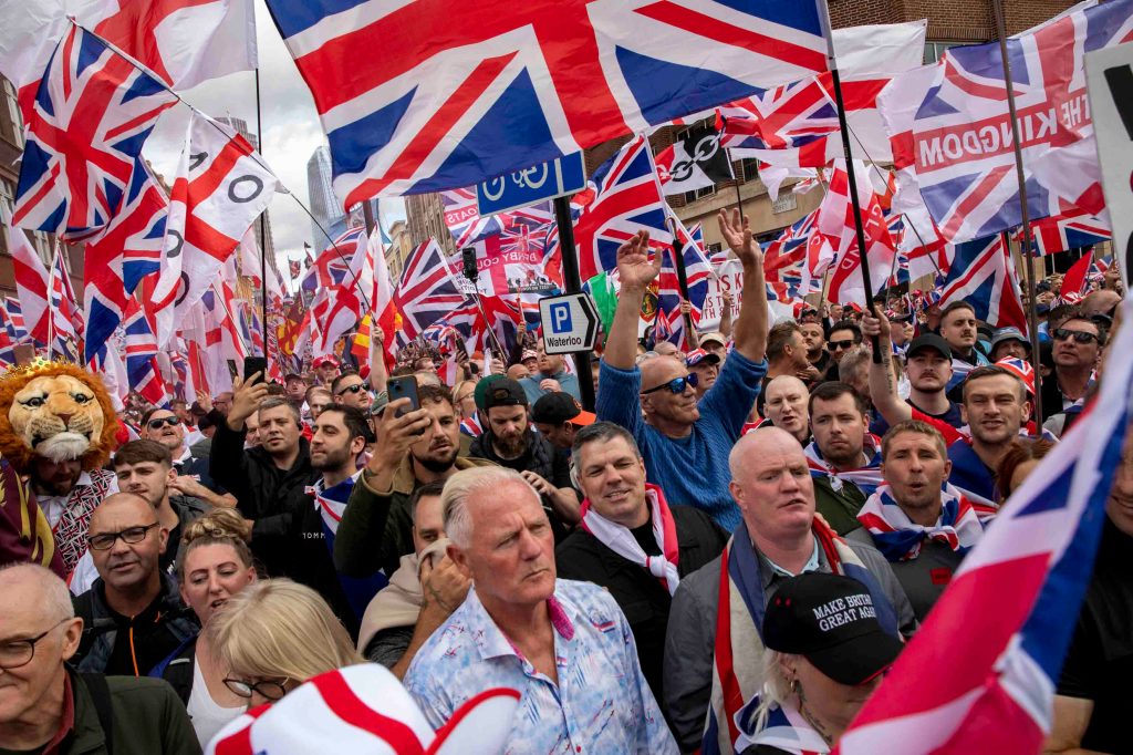 9月13日,英国出现有史以来规模最大的极右翼抗议集会。据BBC报导,接近15万人在伦敦参加名为“团结王国”(United the Kingkom)的游行。游行中出现激烈的警民冲突,约有26名警员受伤,24名抗议者被捕。