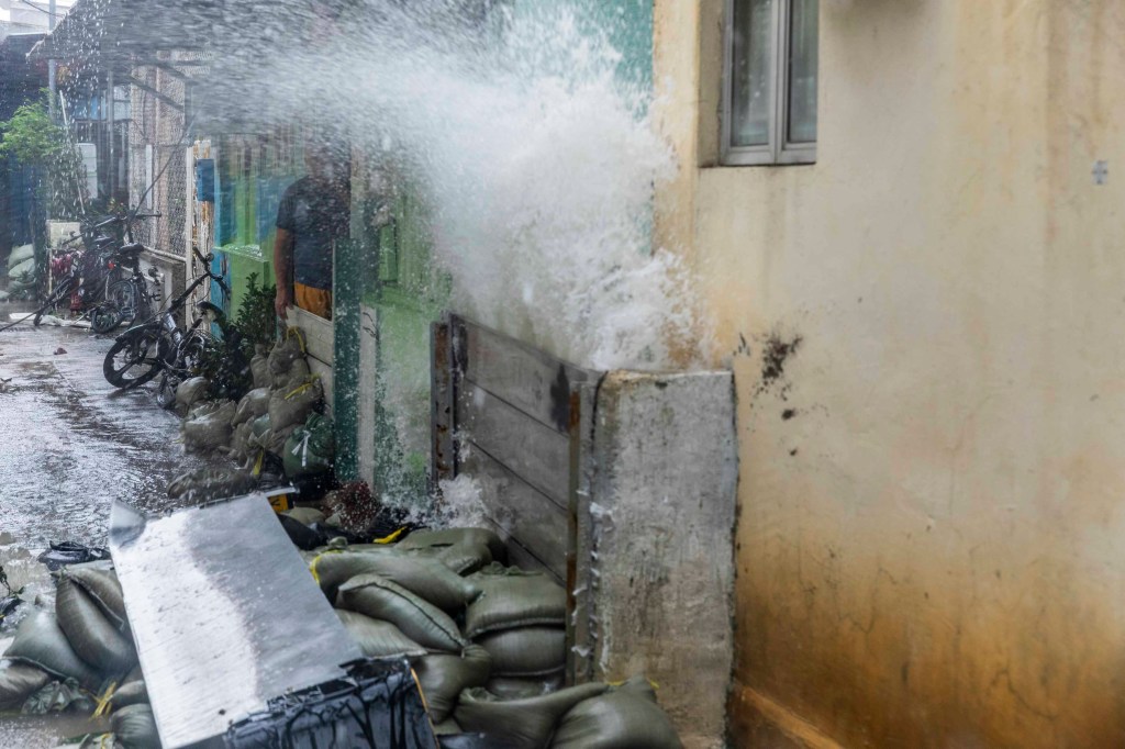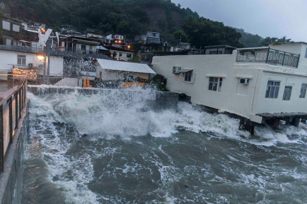 2025年9月24日,超强台风桦加沙袭港,鲤鱼门三家村有海水冲上岸。摄:林振东/端传媒