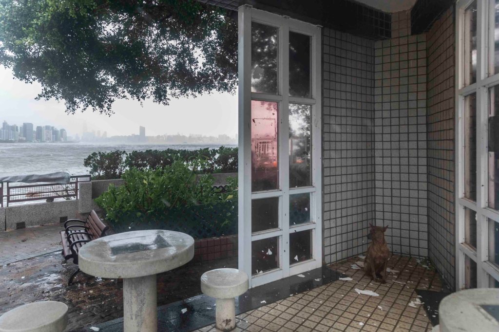 2025年9月24日,超强台风桦加沙袭港,鲤鱼门三家村大风大浪,一只狗在有盖地方避风。摄:林振东/端传媒