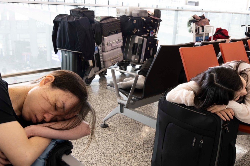 2025年9月23日,超强台风桦加沙逐步靠近香港,不少航空公司因而取消航班,有旅客在机场睡觉。摄:邓家烜/端传媒
