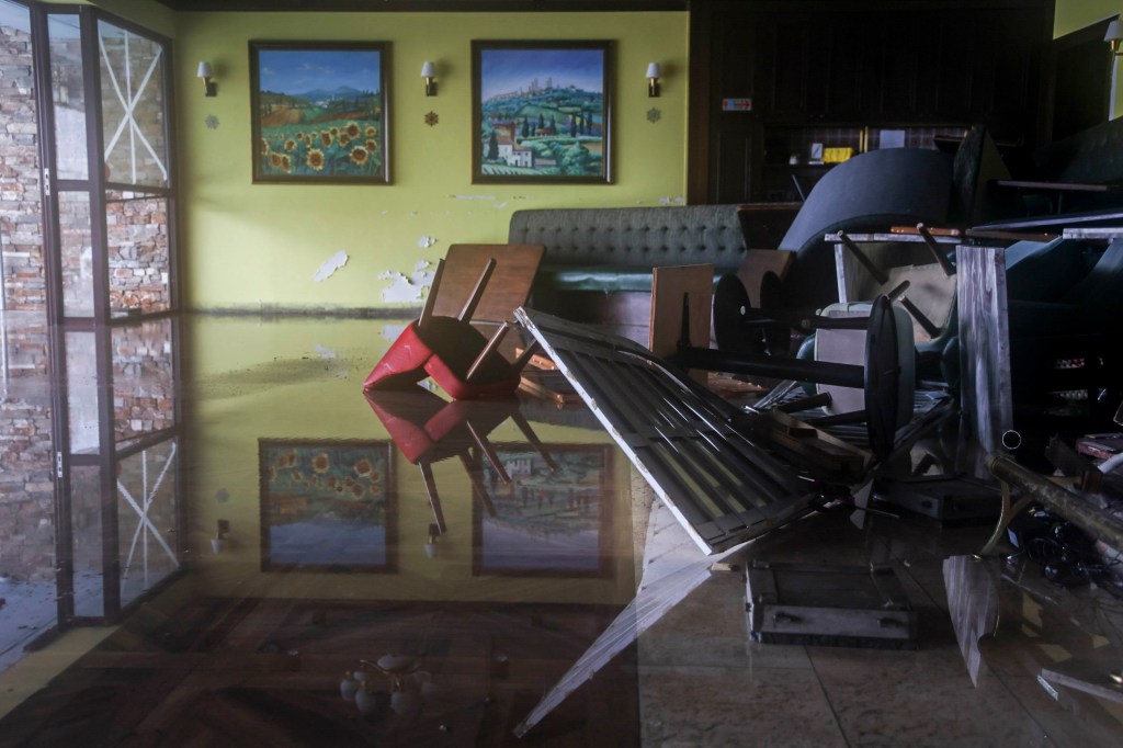 2025年9月24日,超强台风桦加沙袭港,早上的风暴潮使猛烈大浪涌向将军澳海滨长廊旁的酒吧,冲散门窗及椅桌。摄:邓家烜/端传媒