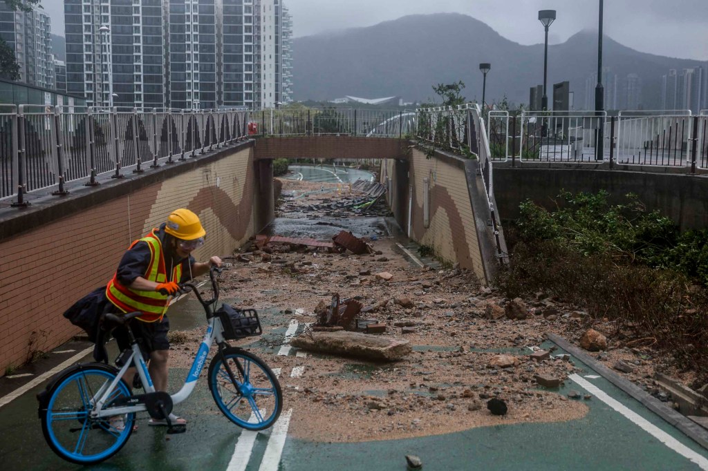 2025年9月24日,超强台风桦加沙袭港,将军澳海滨长廊的栏杆及砖瓦被冲散至单车径。摄:邓家烜/端传媒