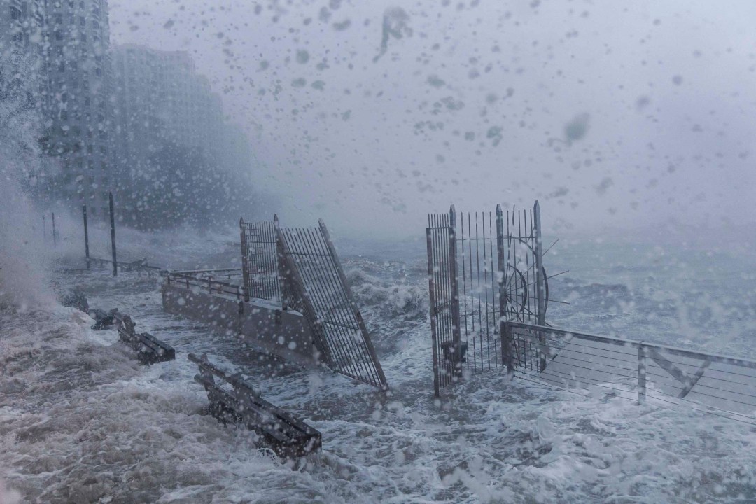 2025年9月24日,超强台风桦加沙袭港,杏花邨涌浪冲毁铁栏。摄:邓家烜/端传媒