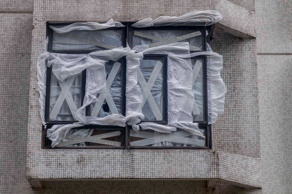 2025年9月24日,超强台风桦加沙袭港,杏花邨有市民以胶纸及胶袋封窗,胶袋在强风下飘摇。摄:邓家烜/端传媒