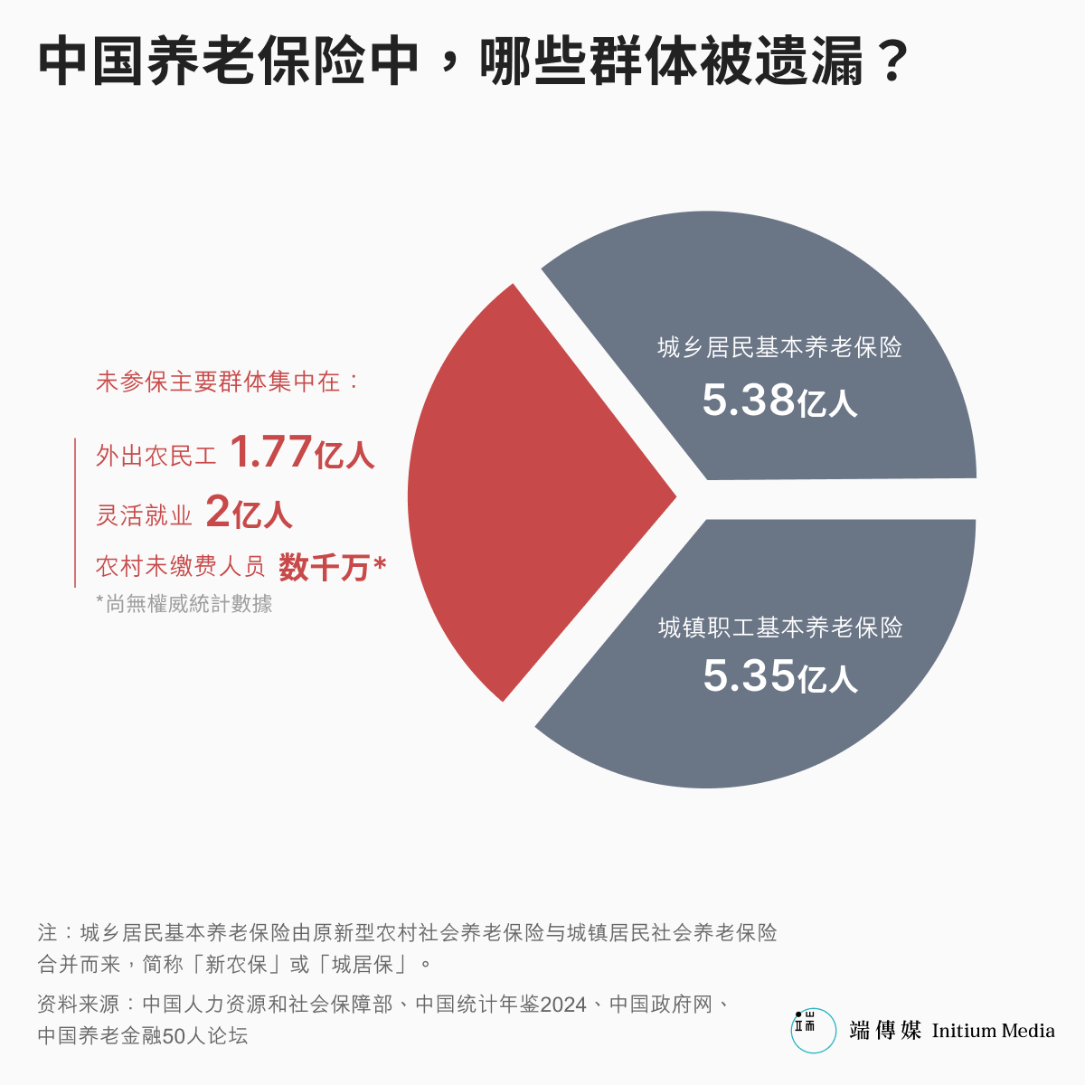 根据中国国家统计局数据,截至2024年底,全国灵活就业人员规模在2.4亿人左右,占劳动人口比例接近三分之一。目前尚没有灵活就业人员参保率的数据,但武汉大学管理学博士薛惠元等人的研究指出,2020年灵活就业人员城镇职工基本养老保险参保率仅为28.5%。由于缴费标准高、手续繁琐、户籍地和工作地限制等问题,他们游离在养老金制度之外。