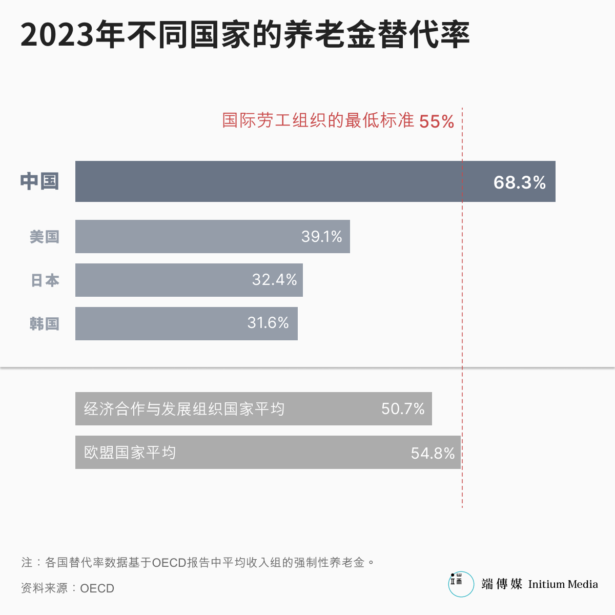 根据经济合作与发展组织(OECD)2023年的报告,以平均收入组的强制性养老金为基准,中国养老金替代率高达68.3%,远高于同样面临严峻人口问题的日本和韩国。由于养老金替代率通常呈现收入越高替代率越低的特征,这一数字并不能真实反映中国的退休生活质量。