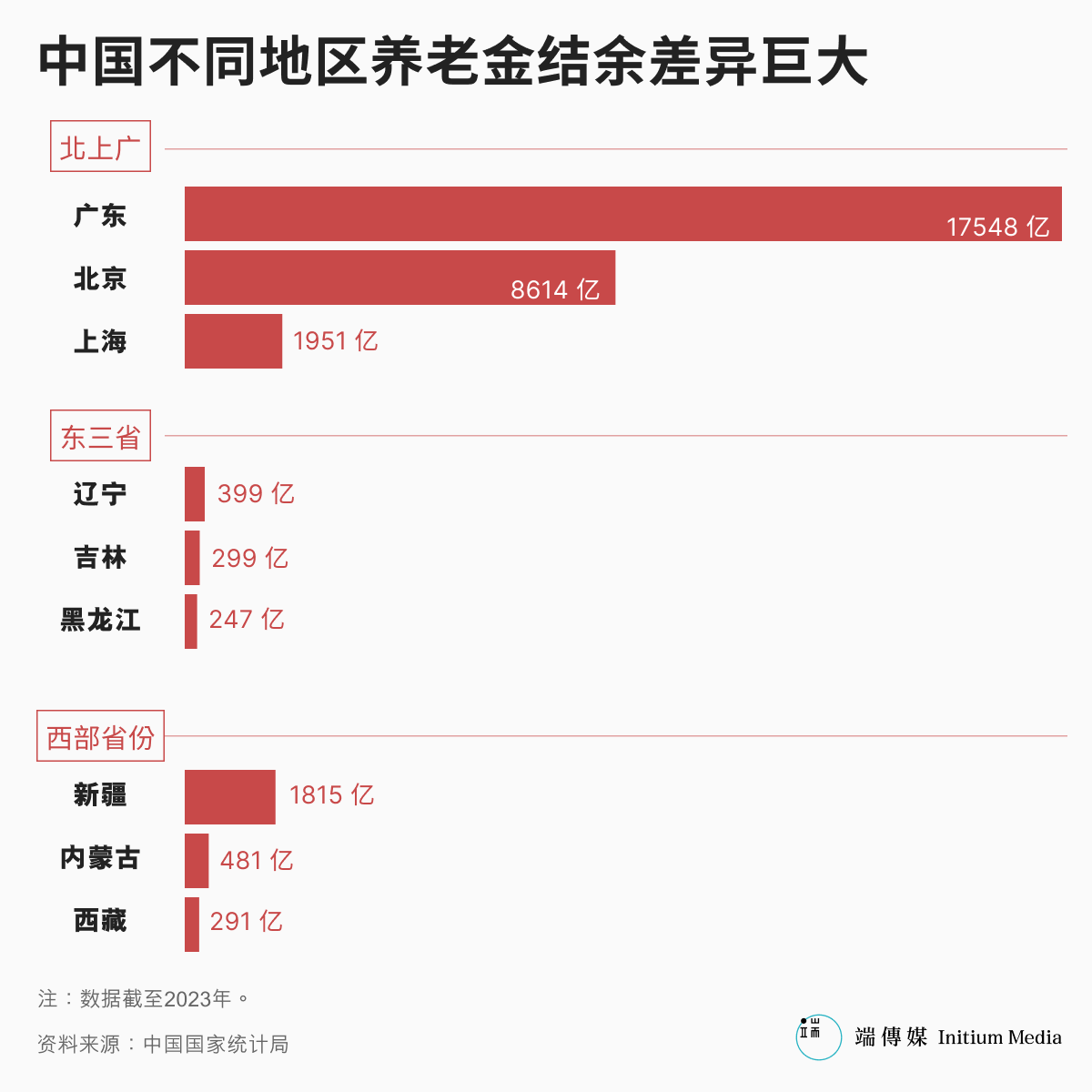 北上广等发达地区的养老金结余也明显高于其他地区。据国家统计局数据,广东2023年底累计结余约1.8万亿元,是全国最高,这主要得益于大量外来务工人员流入,缴费人数增长对冲了老龄化影响。东三省结余压力最大,缺口超千亿,需中央拨付资金。其中有老龄化率高、劳动人口外流、生育率全国垫底的原因,也因为近年来经济转型困境、缴费基数持续下降、社保缴费激励不足。