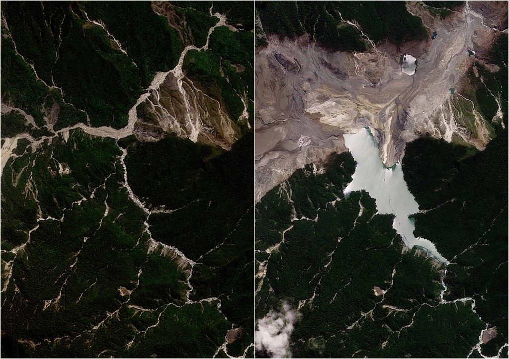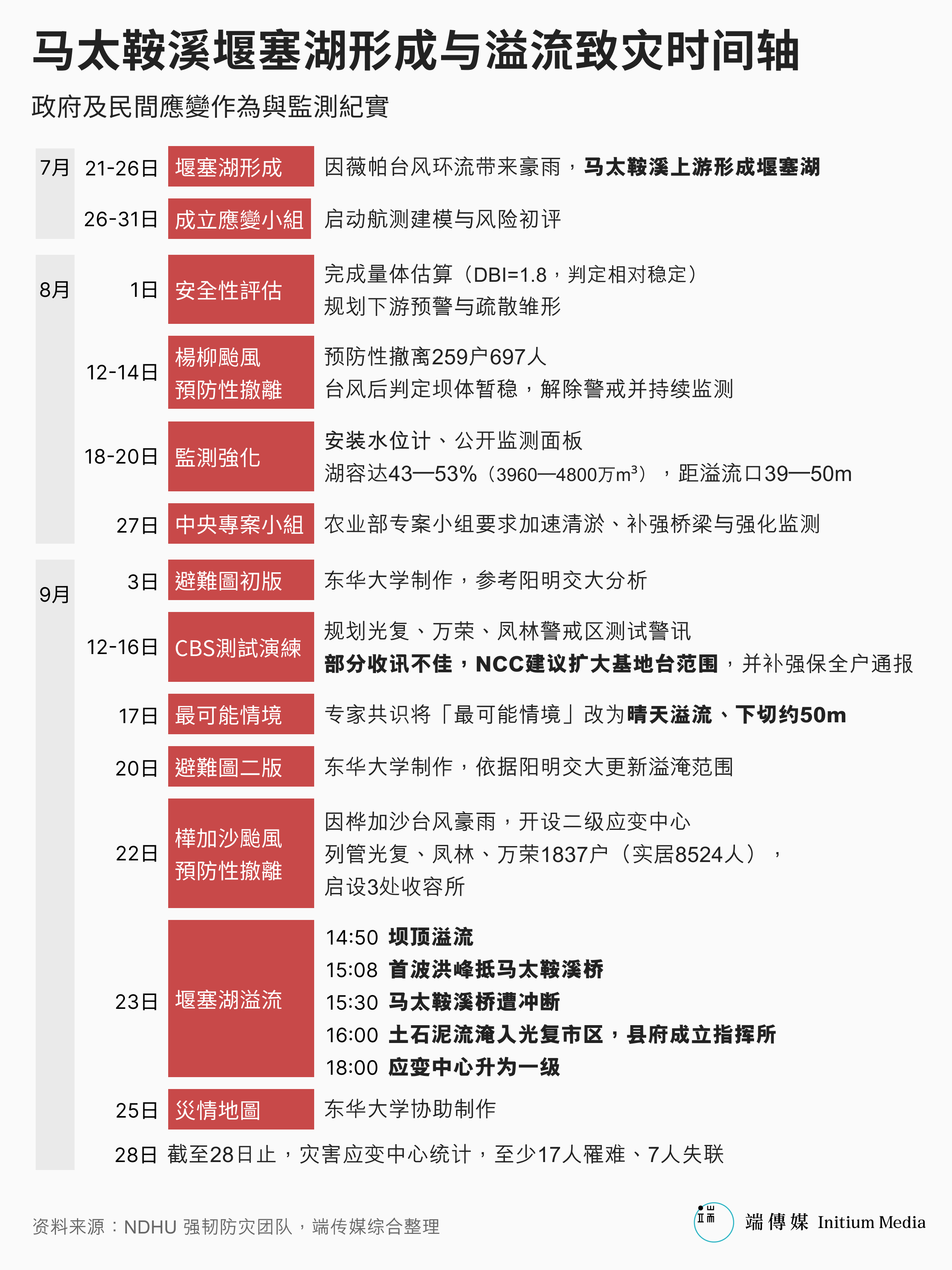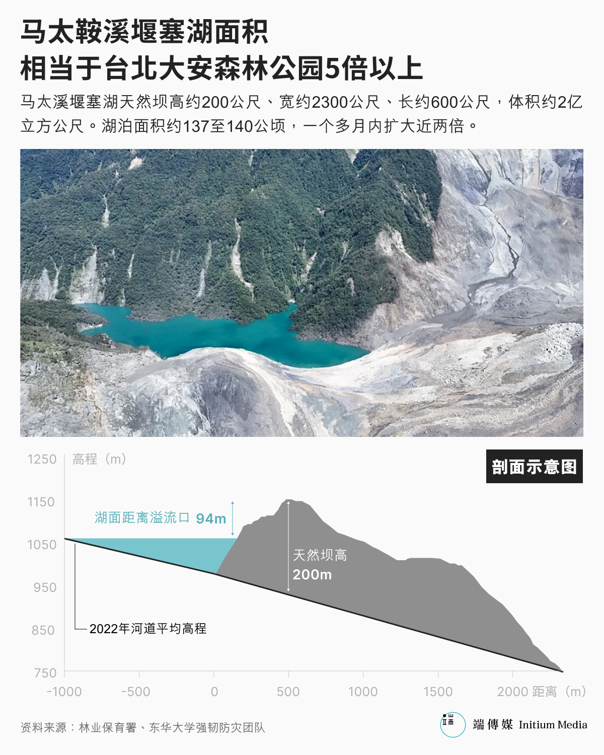 这起灾难源头可追溯至今年7月,根据林业及自然保育署(下称林保署)花莲分署的空勘资料,7月下旬至8月上旬期间,台风“薇帕”环流带来豪雨,在花莲万荣乡马太鞍溪上游国有林班地触发大规模崩塌,形成堰塞湖。初期评估显示,天然坝体高度约120公尺,蓄水量约1660万立方公尺,湖面与溢流口高差尚有约94公尺。