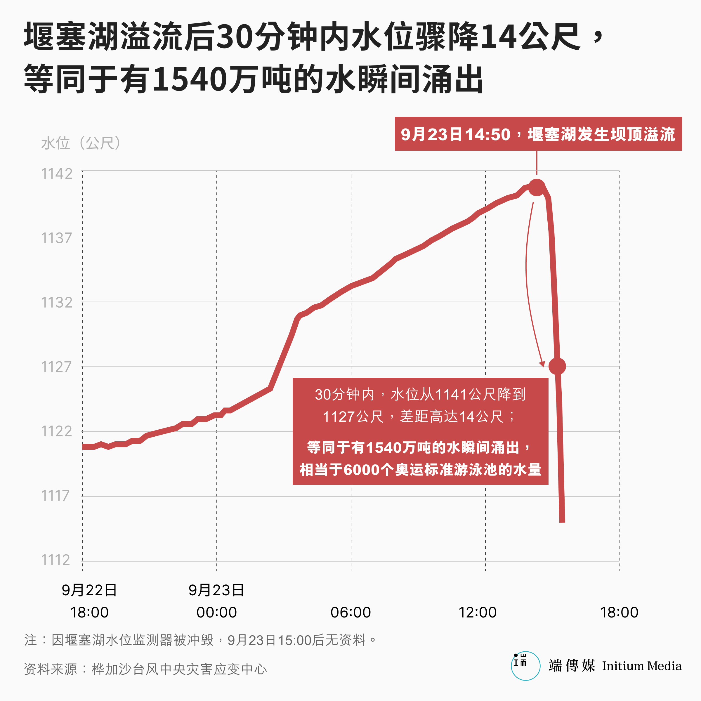 溃坝前的关键时刻,9月23日上午3时,堰塞湖水位开始急遽上升,突破海拔1130公尺。中午12时,水位已逼近1140公尺,距离坝顶可能溢流点非常接近。下午2时左右,水位达到最高点,湖水开始从坝体低洼处溢流。下午2时至3时期间,溃坝发生,溢流造成坝体结构崩溃,形成缺口,湖水夹带土石倾泄而出。下午3时后,水位监测仪器讯号中断,推测已被洪水冲毁。