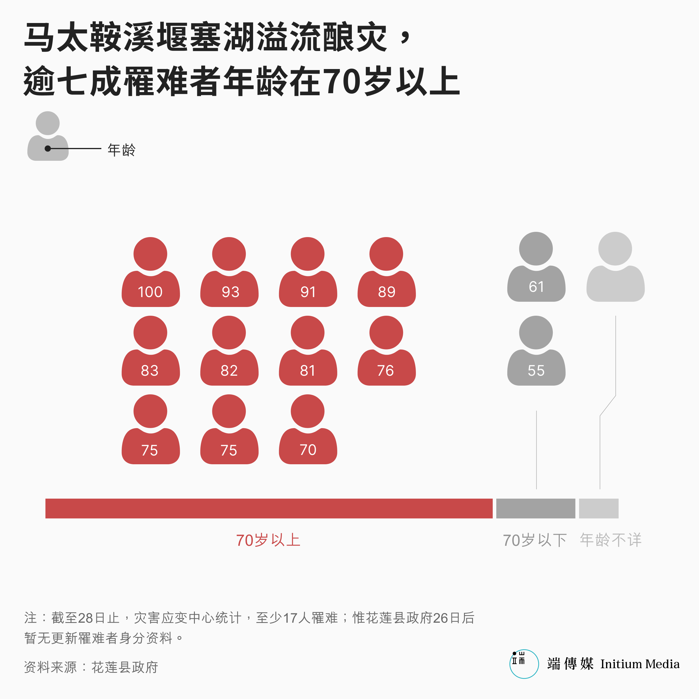 灾情统计方面,根据28日傍晚统计,罹难人数17位、失联人数7位。据花莲县政府26日资料显示,在已知年龄的12位罹难者中,超过7成(9位)的年龄在70岁以上,其中更有7位超过80岁,初步研判,由于罹难者多为行动不便的高龄长者,且堰塞湖溃决的洪峰速度极快,瞬间就灌入并淹没住宅一楼,导致他们完全来不及反应与撤离。