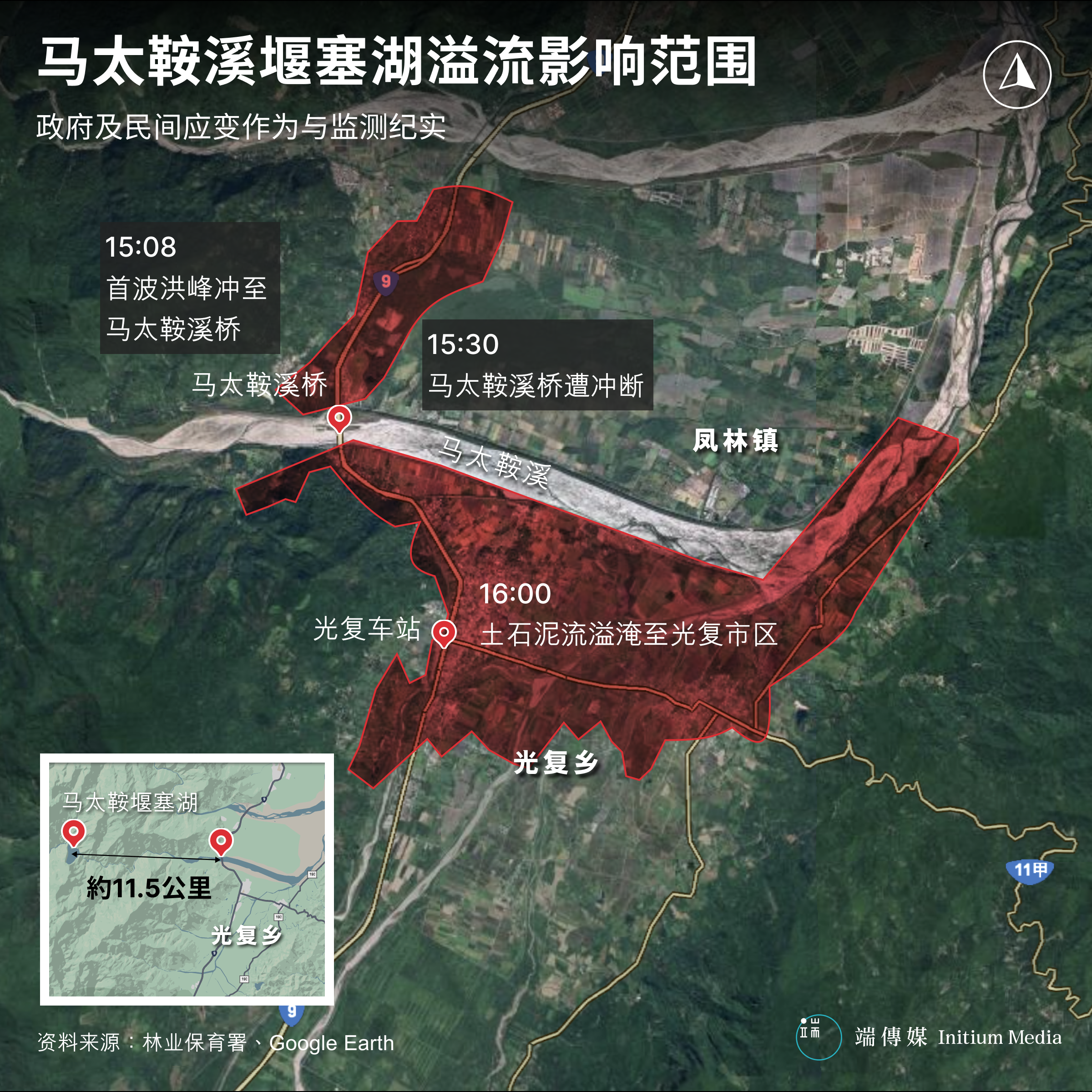 根据监测资料,9月23日下午2时50分,马太鞍溪堰塞湖发生坝顶溢流。首波洪峰于15时08分冲到马太鞍溪桥,并在15时30分左右将桥冲断。16时左右,土石泥流溢淹至光复市区,洪水夹带滚滚泥流,甚至淹至一层楼高。