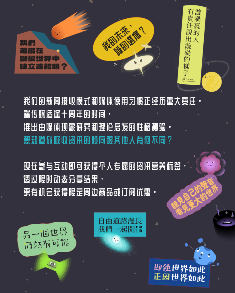 透过情景问答,你将会进入一个被资讯过载和演算法支配下,进入扁平时代的未来。当所有话题变得单一乏味,你跟朋友决意出发,重建久违的多元世界。我们偏好不同议题的形式、接触内容的方式以及支持媒体的模式,跟大家经常讨论的注意力碎片化、过滤气泡、末日刷屏以至回音室效应现象之间会否有意想不到的连结?性格测验尝试分析你的新闻接收模式,你更可以透过限时动态分享分析结果并跟身边人比较各自的媒体使用习惯,同时有机会获得限定周边商品或订阅优惠。