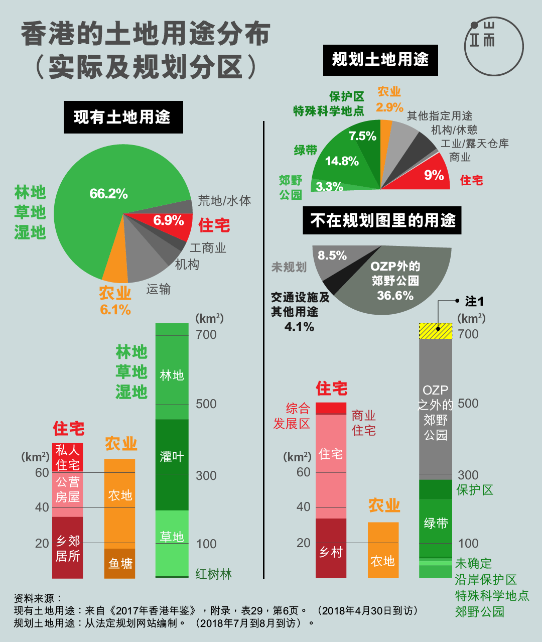 • 香港尚未规划的土地面积为96.8平方公里(9680公顷):香港已经规划的土地用途仅占562.2平方公里,包括36.7平方公里的郊野公园。郊野公园总面积为443平方公里,所以分区计划大纲图外的郊野公园的土地面积是406.3平方公里 (443 - 36.7)。562.2 + 406.3平方公里= 968.5平方公里。此外,有45.7平方公里为交通设施等用途。换句话说,香港有96.8平方公里(1,111平方公里 - 968.5平方公里 - 45.7平方公里)的土地未被规划。这部分没有规划的土地大部分在新界,约占香港建成区(271平方公里或香港土地的24.4%)的35.7%。