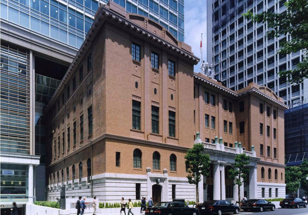 从东京站中央口出来,穿过车站广场,便是行幸通。路口是两座巨构商业综合体,左(西)边丸大厦,右(东)边是新丸大厦,两座梦幻般的智能化大厦仿佛是从北缘镇守着“日本的玄关”。紧挨着新丸大厦,是一幢土红色五层古建,体量也相当大。这就是旧日本工业俱乐部会馆,由横河工务所设计,1920(大正九)年竣工,是日本国内存量极少的十九世纪维也纳分离派风格的建筑。正门玄关的柱廊、浮雕,玄关正上方、五层楼顶上象征大工业时代的矿工和纺织女工的雕塑,古色古香的大门及其繁复的装潢,都是百年前的原装,乍一看不会有任何违和感。
